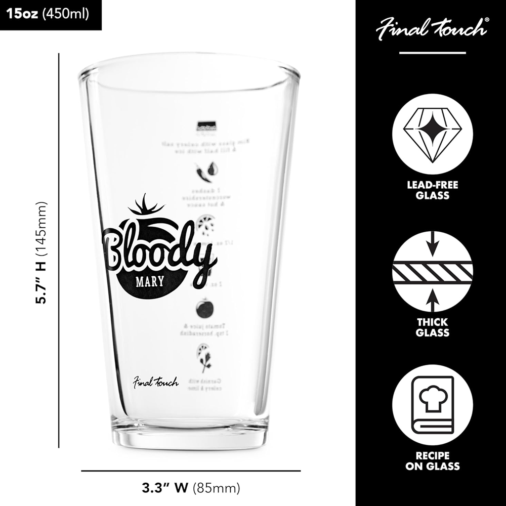 Servez le Bloody Mary ultime avec ce coffret tout-en-un. Givrez facilement chaque verre grâce au plateau à givre inclus, doté d'un couvercle qui sert également de bac à jus de citron/citron vert. Ajoutez ensuite des glaçons et les ingrédients dans chacun des 4 verres inclus. Vous ne connaissez pas la recette ? Aucun problème. Suivez simplement la recette imprimée au dos de chaque verre.