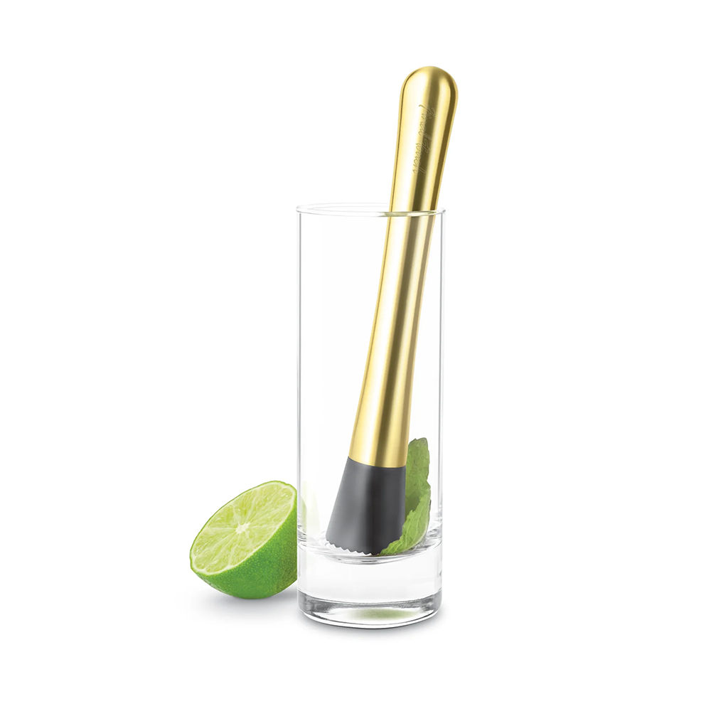 Cet ustensile de bar indispensable est parfait pour préparer des mojitos, des juleps à la menthe et des caïpirinhas. Sa tête en plastique alimentaire est dotée de petites dents pour écraser les ingrédients rapidement et facilement. Fabriqué en acier inoxydable plaqué laiton, son manche robuste est courbé et ergonomique pour une prise en main confortable.