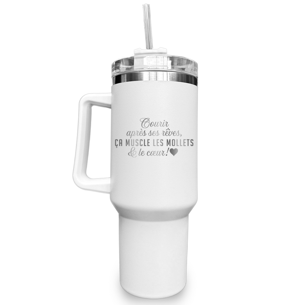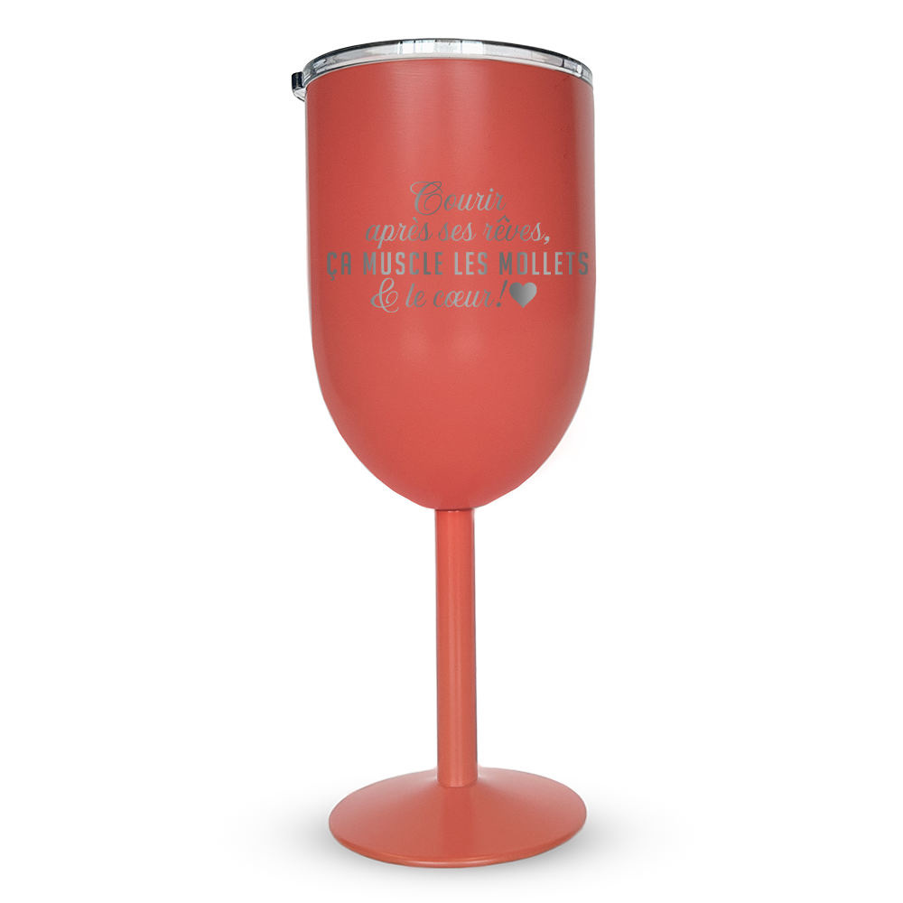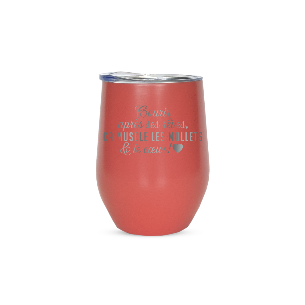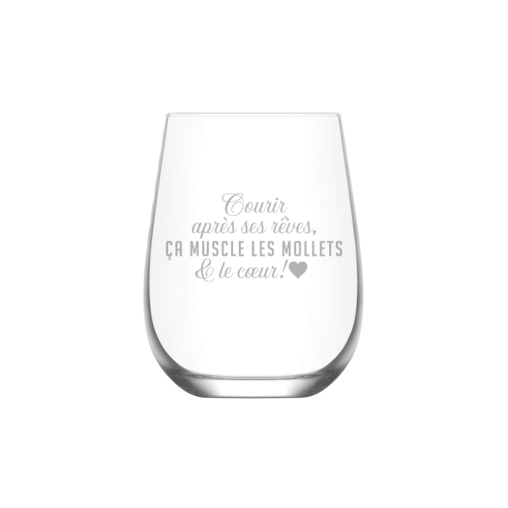 Gravure au laser avec inscription « Courir après ses rêves, ça muscle les mollets & le coeur »