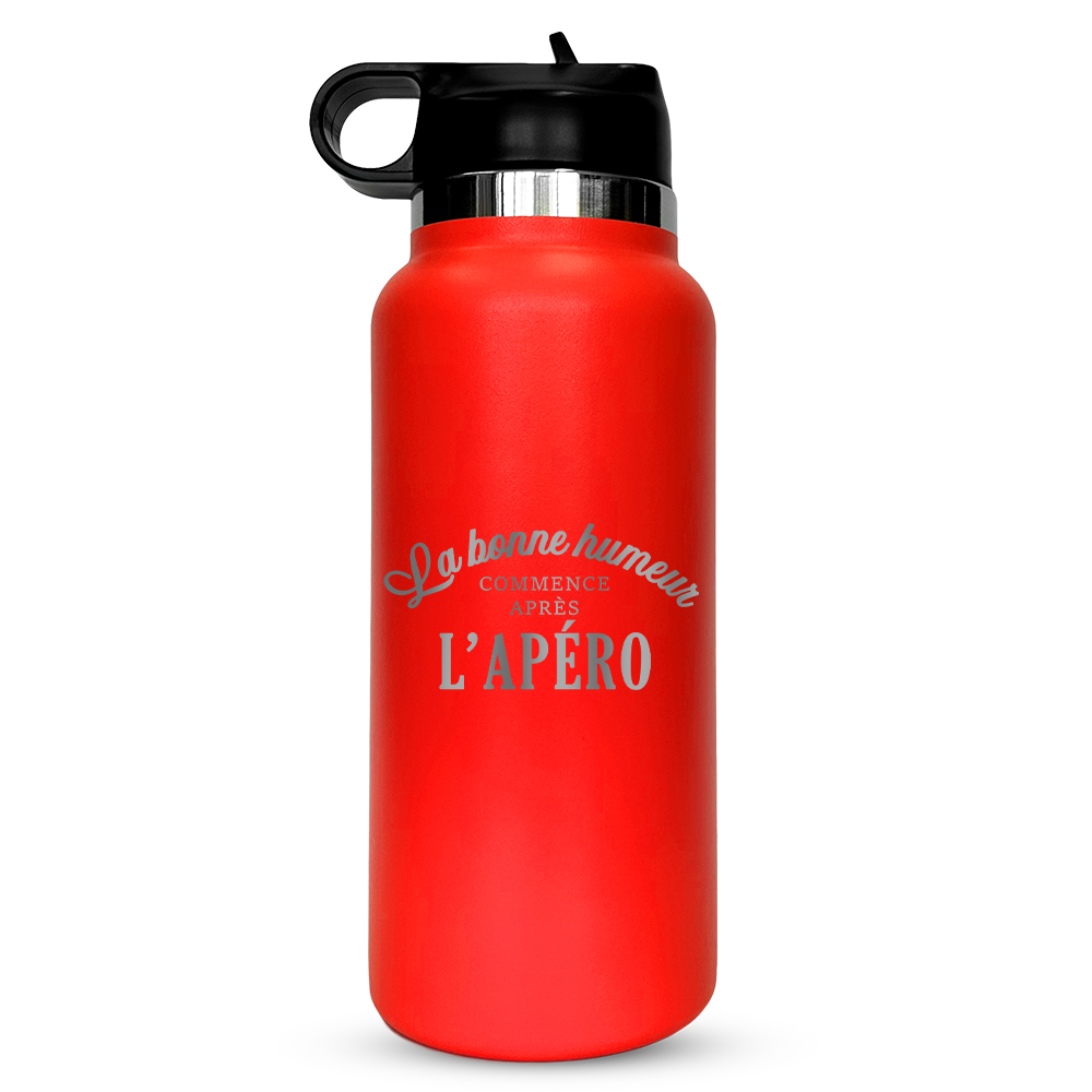 Gravure au laser avec inscription « La bonne humeur commence après l'Apéro »