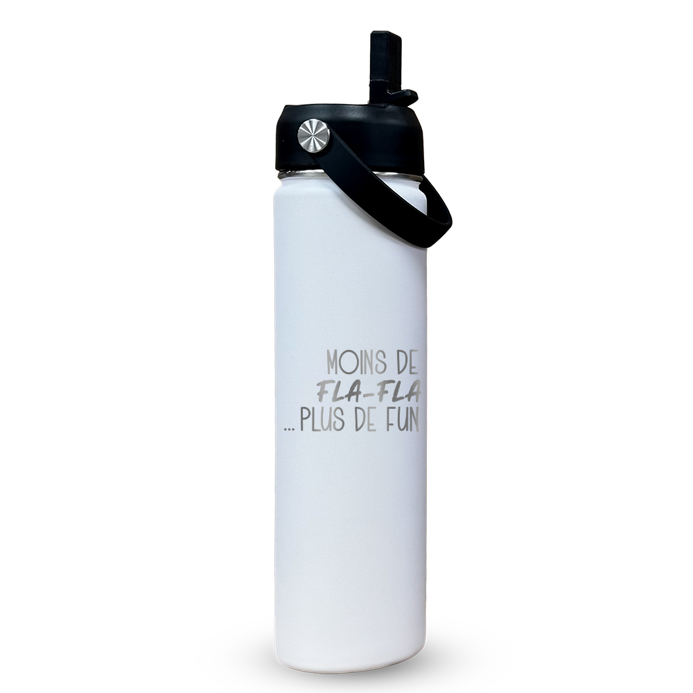 Gravure au laser avec inscription « Moins de fla-fla... plus de fun »